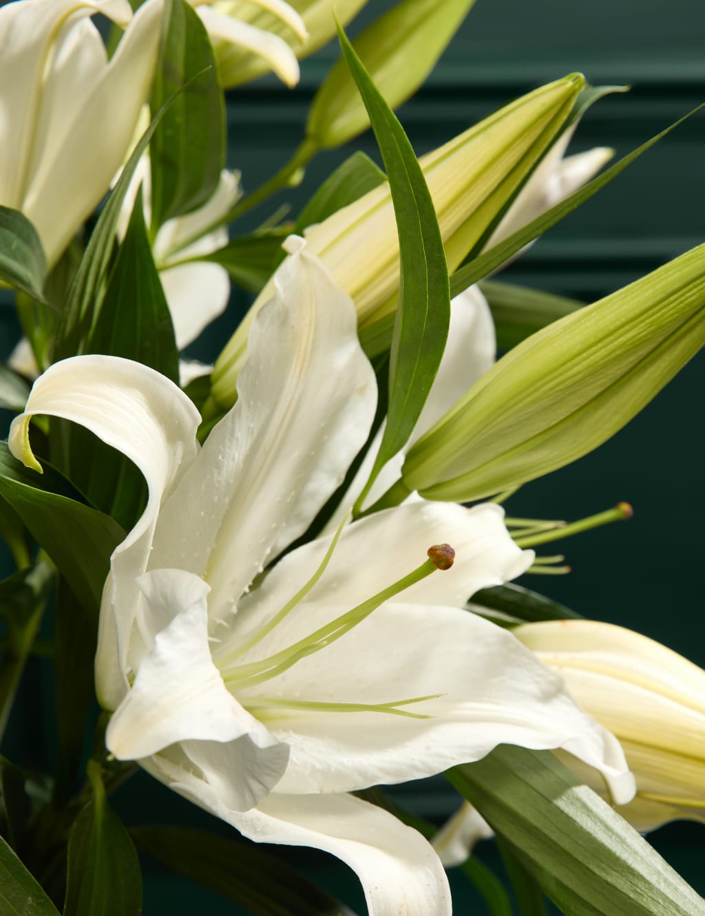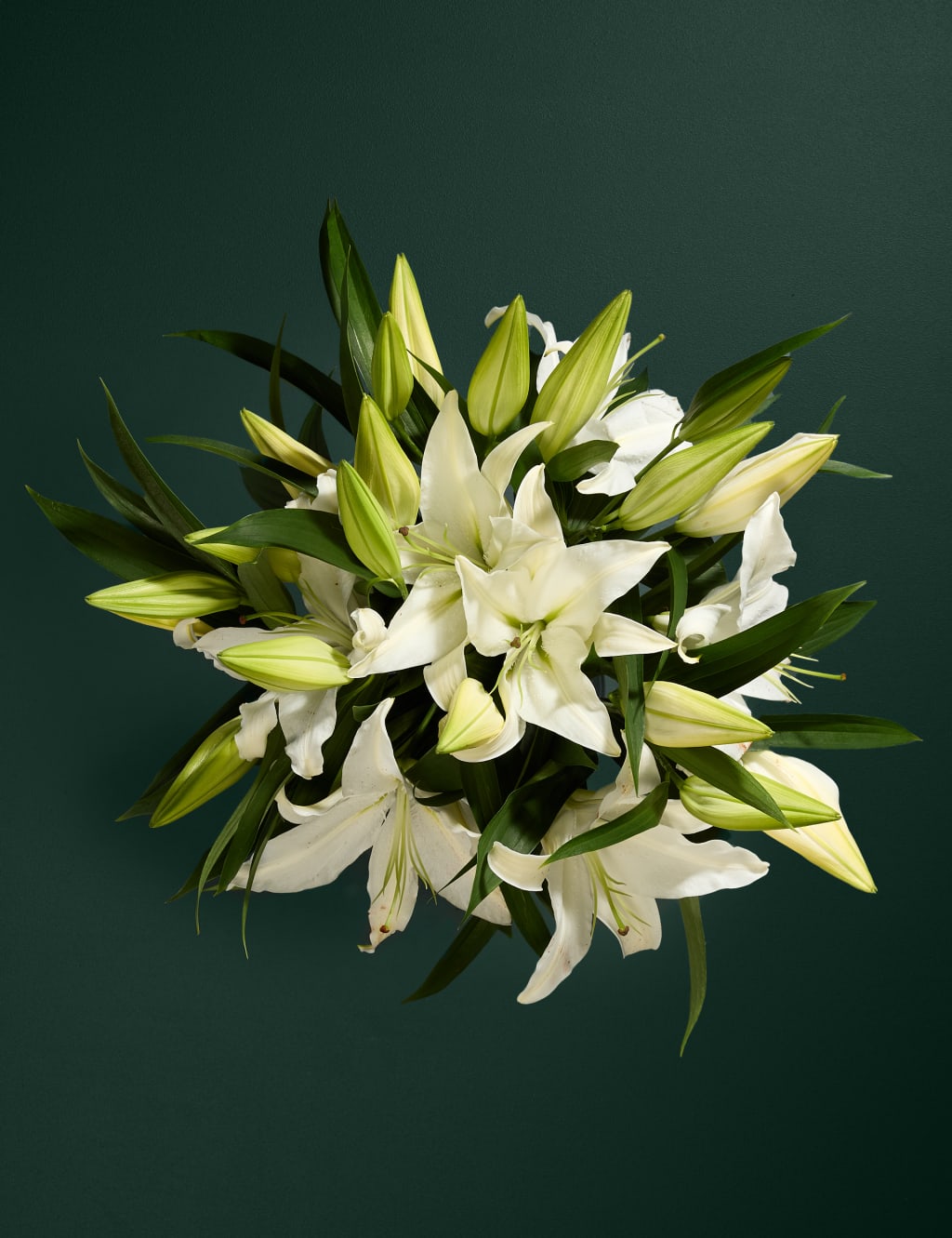 Baltas lilijas, baltas lilijas Ziedu pušķis ir grezns elegantu un smaržīgu baltu liliju kompozīcija. Jūs varat izvēlēties vēlamo daudzumu.