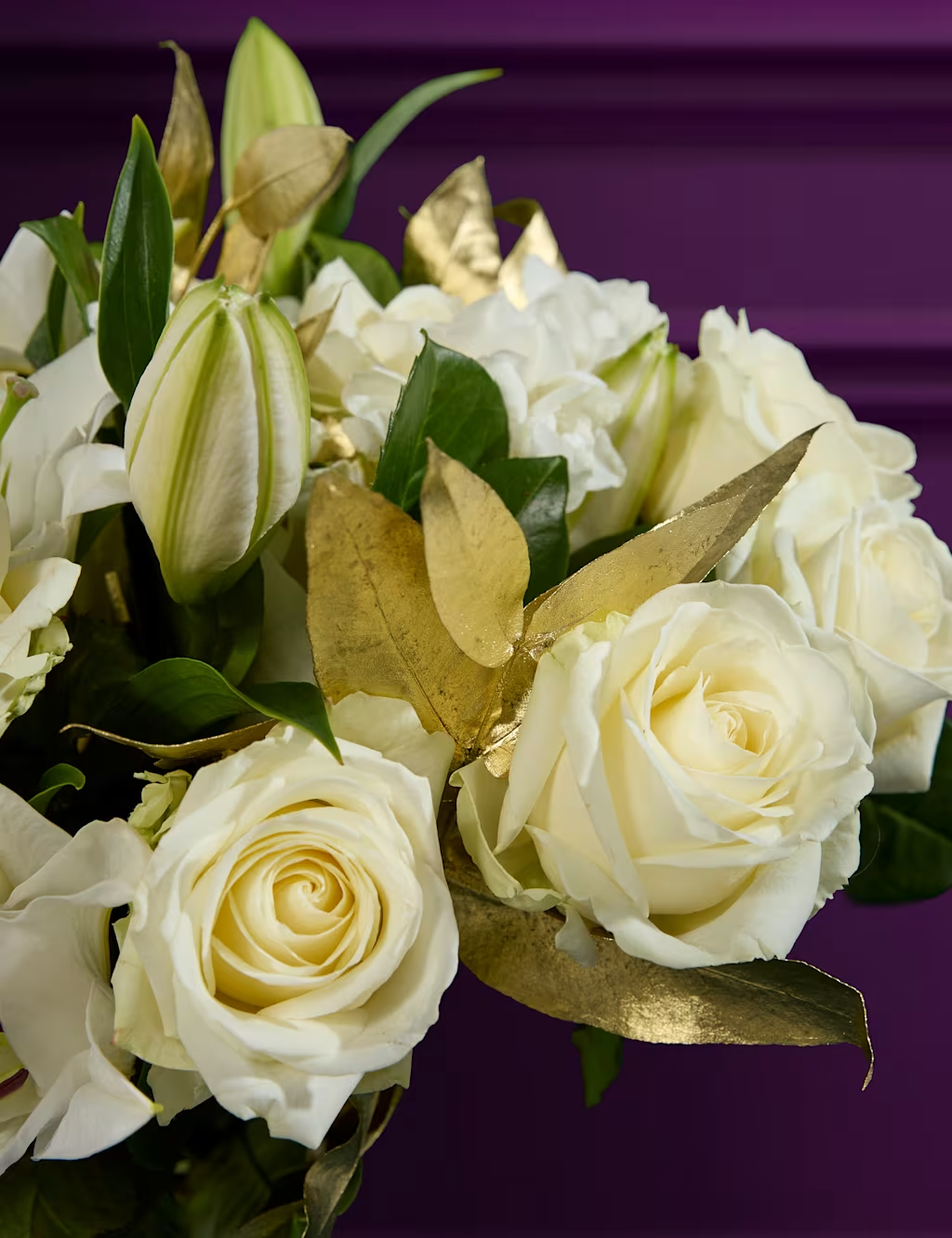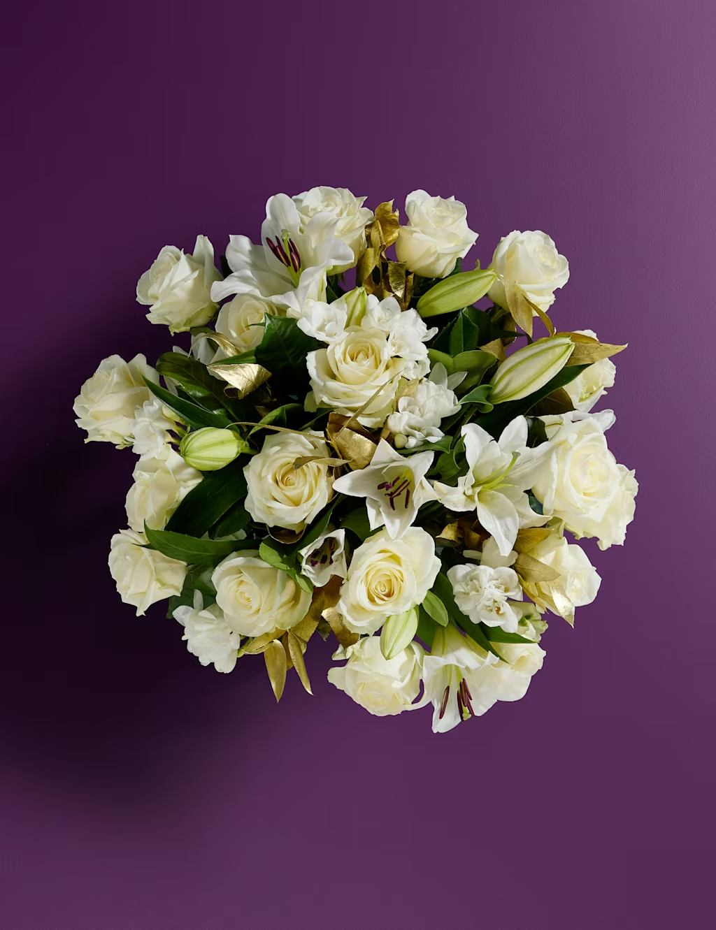 Pēc rūpīgas atlases veidots baltu rožu, frēziju un liliju pušķis. Burvīga krāsa un neatkārtojams aromāts ir vārdi, ar kuriem raksturot šo ziedu pušķi, kas ir ideāli piemērots svētkiem, kā dāvana mīļotajam cilvēkam un jebkuram citam gadījumam. Šī ziedu kompozīcija izgaismos jebkuru mājas telpu.