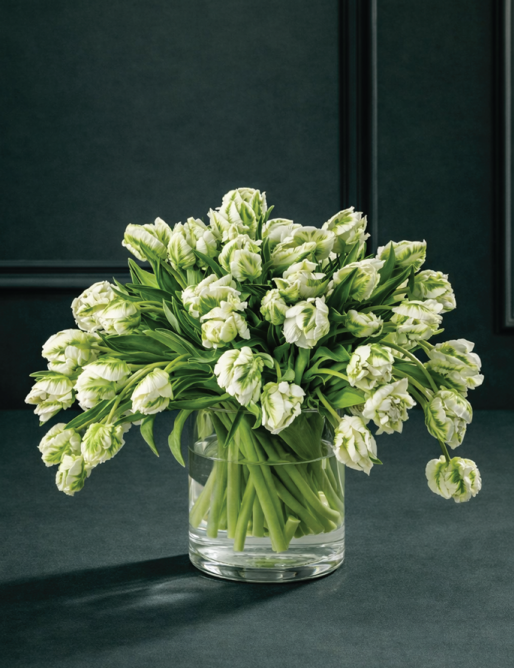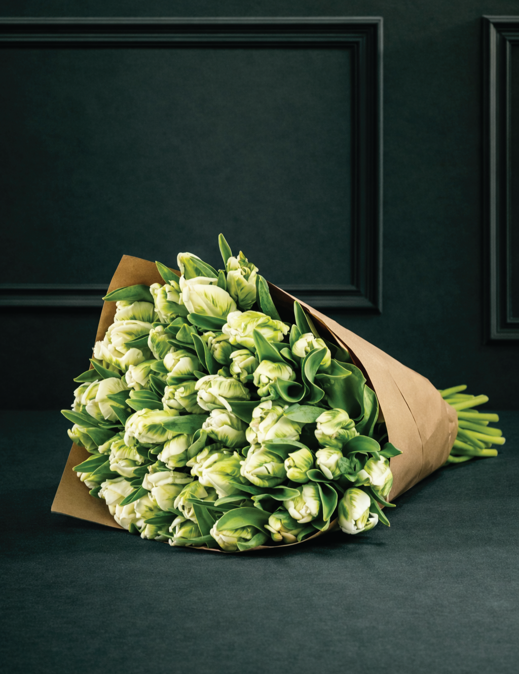 - Balti zaļš, papagaiļa formas, krāsās mainīgs tulpju ziedu pušķis