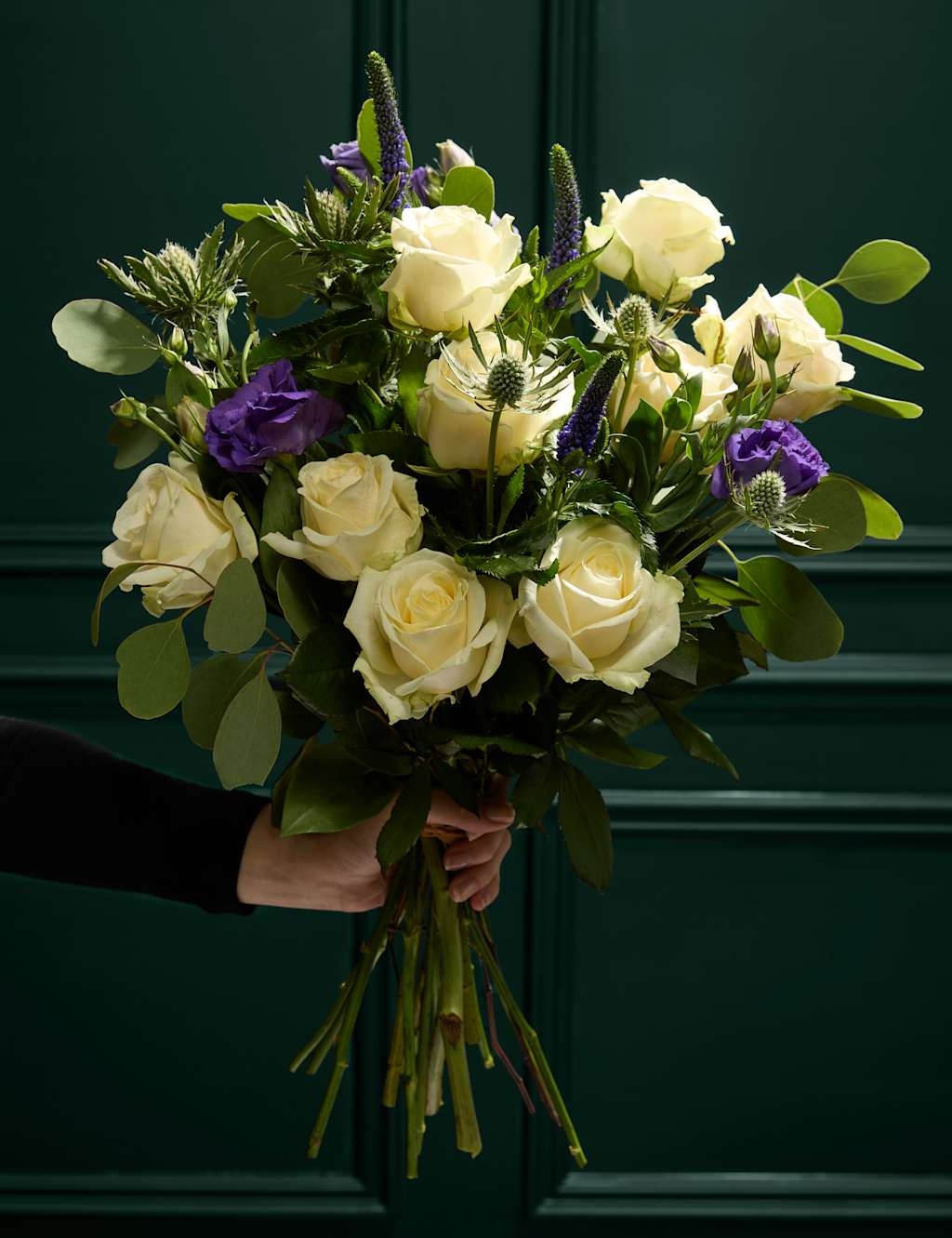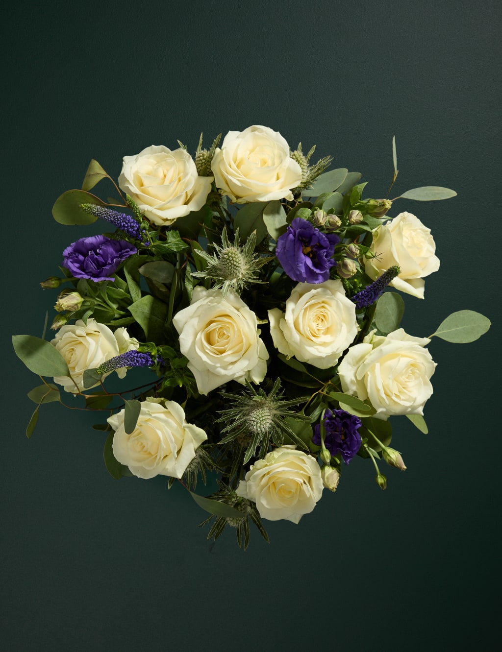 Viendabīgas un baltas rozes – ļoti bagātīga kompozīcija, kas ir ideāli piemērota īpašiem dzīves mirkļiem. Pušķi veido klasiskās baltās rozes un eustomas, ko papildina sezonas zaļumi, eikalipta lapas un violeti veronikas ziedi.