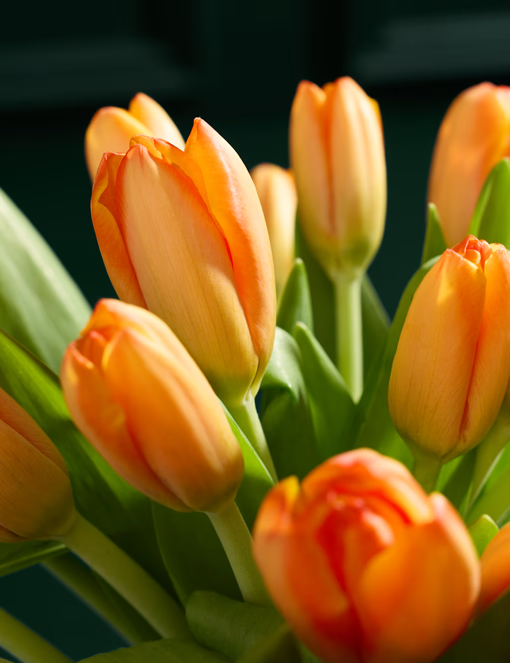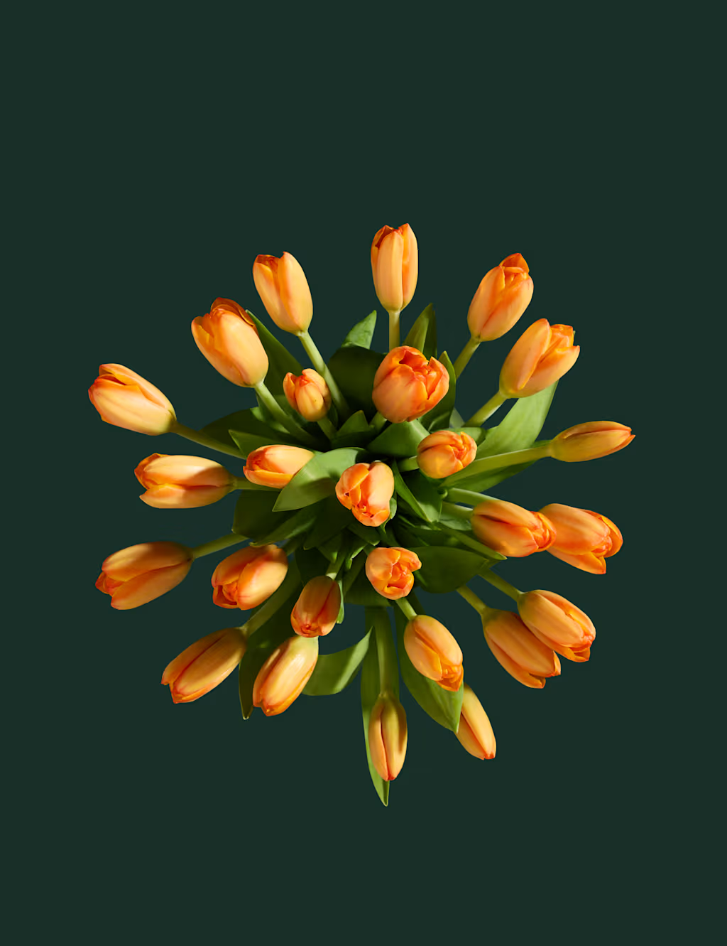 Deklams un burvīgs oranžu ziedu pušķis, kas iemūžina pavasara skaistumu tā visskaistākajā formā. Katram tulpju ziedam ir oranži dzelteni ziedlapiņas un graciozas līnijas, radot pavasarīgu un atsvaidzinoši modernu izskatu. Lieliski piemērots svinībām, apsveikumiem vai vienkārši dienas uzmundrināšanai. Šis oranžo tulpju ziedu pušķis ir jauks, nenovecojošs un skaists savā vienkāršībā. Tas lieliski noderēs arī mājās kā kompozīcija.