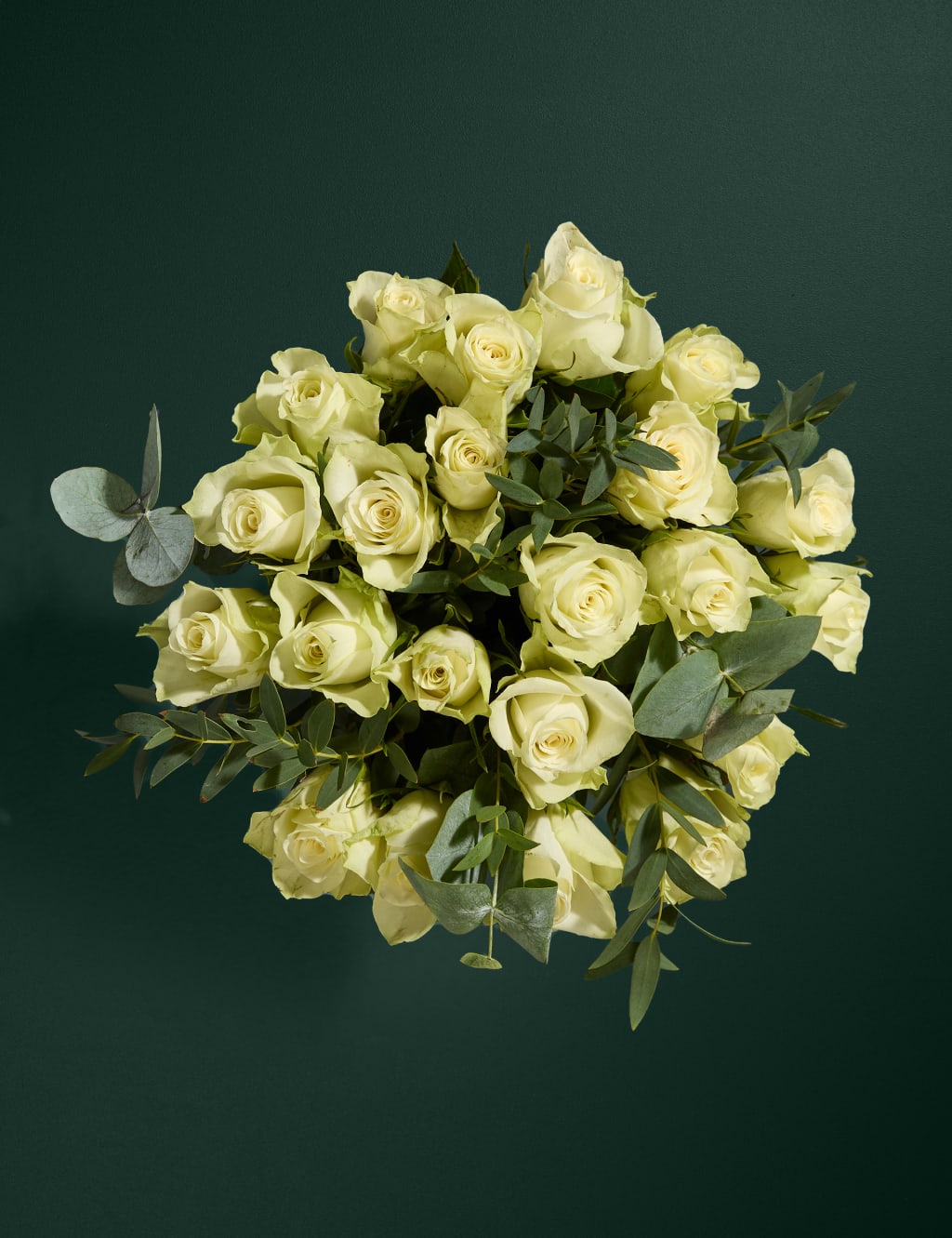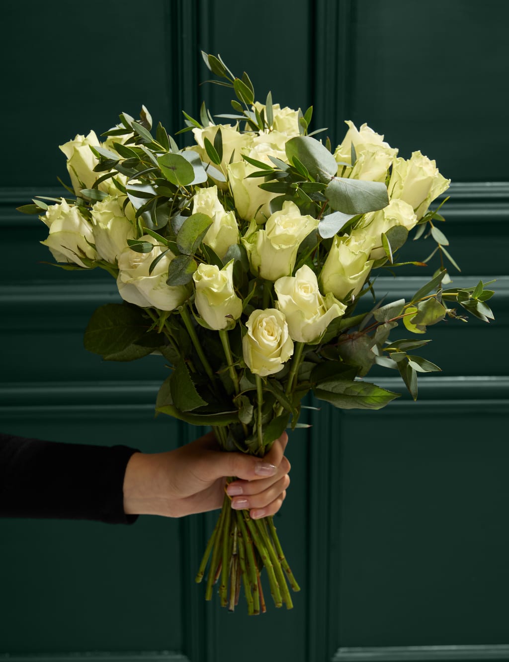 - Kristīgais balto rožu un eikalipta ziedu pušķis