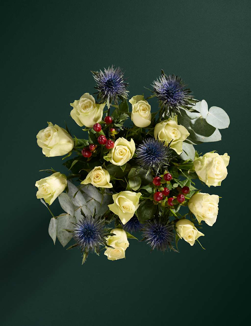 Izrādiet savam īpašajam cilvēkam, ka domājat par viņu, ar šo svētku pušķi no baltām rozēm, asinszāles un sezonāliem zaļumiem.